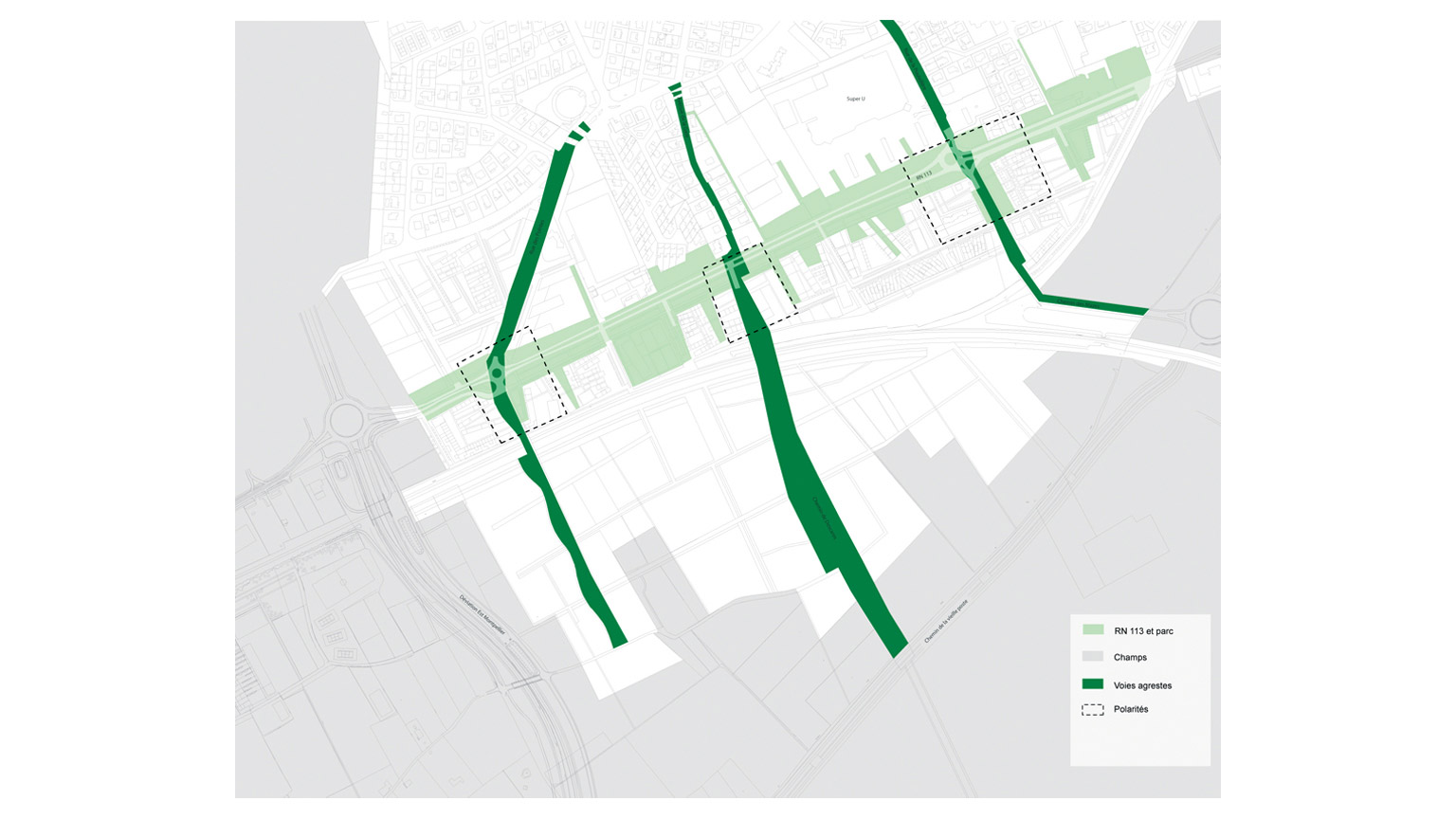 La mise en place de 3 axes paysagers, liés à distance avec le territoire agricole, recentrent la RN 113. Au croisement 3 carrefours constituent les 3 pôles principaux de la structure du plan: Activités, commerces, équipements, tertiaire, etc.